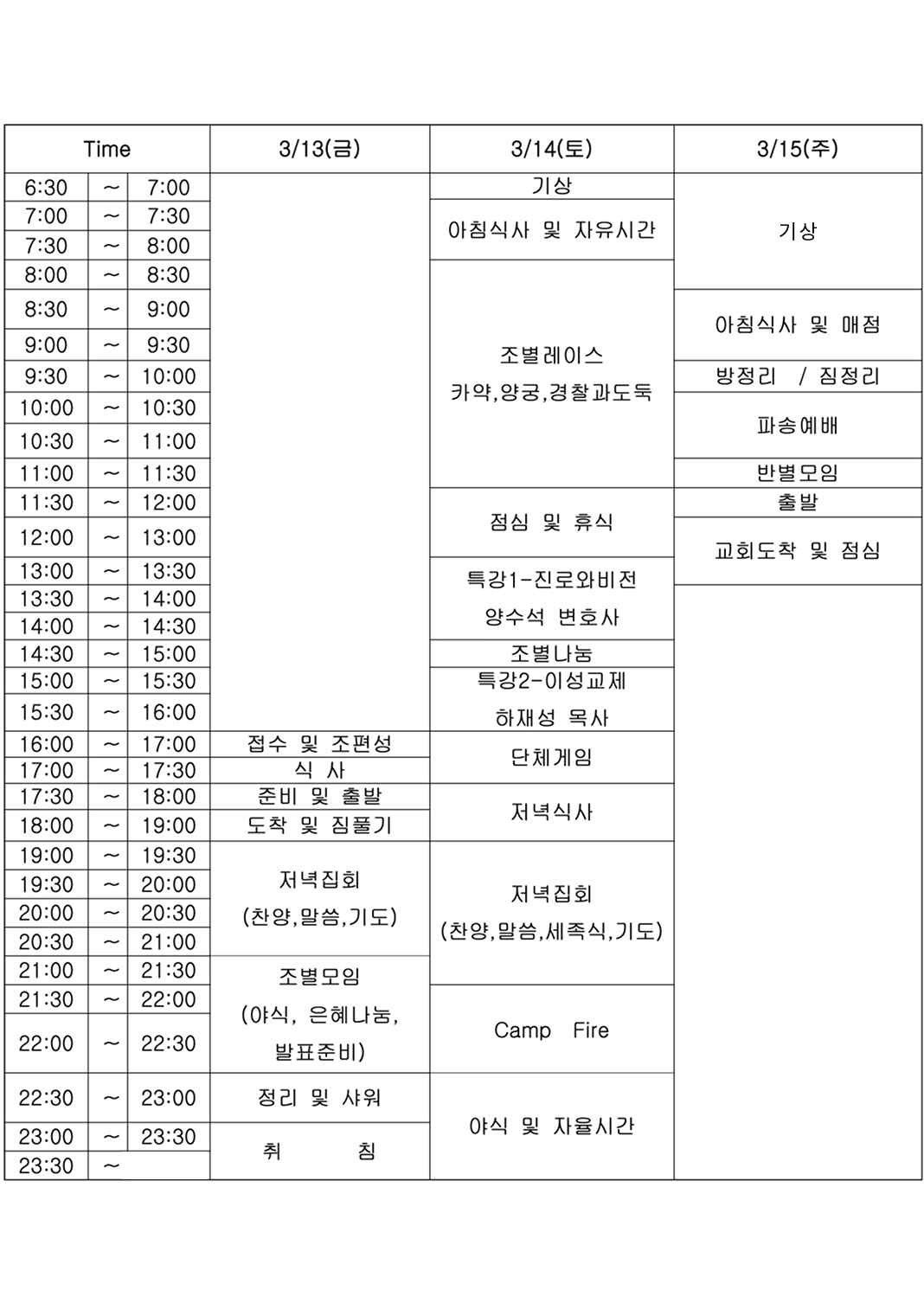 • 예배, 집회, 식사, 활동 시간 정시에 참여하기 Be punctual: Be on time for all programs.